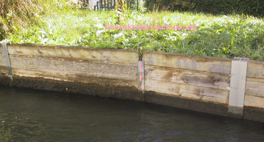 In letzter Zeit aber rammten sie Eisen ein, mit Schreitbagger und Wasserwaage, damit’s senkrecht wird. Aber senkrecht blieb’s dann nicht, denn sobald sie ihren Kies hinter die Holzwand baggerten, kippte die Wand Richtung Kanal. “Das drückt das Wasser wieder hin”, sagten sie - so gescheit muß man mal sein! Ja das Wasser. Fließendes Wasser hat einen kleinen Kopf und der drückt nicht.