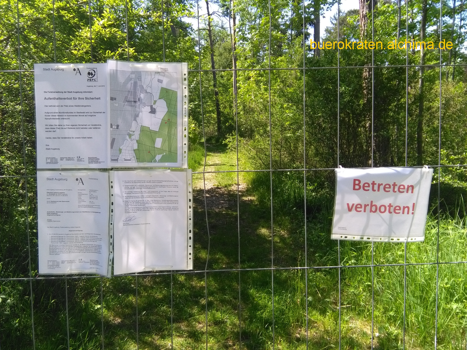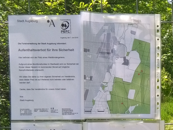 Das Forstamt sperrte im Juni 2019 vier Bereiche bei Waldkindergärten in Haunstetten. Aufgrund eines Munitionsfundes wurden sie auf Kampfmittel untersucht (s.a. Amtsblatt Stadt Augsburg vom 6.6.2019). Hier wird nach einem Kampfmittelfund der Boden untersucht. Bei der Lochbachsanierung durch die Kraftwerksbetreiberin des T 2 in Haunstetten wurde 2015 nach dem Fund einer Brandbombe blind weiter gerammt und die Gefahr einer tödlichen Explosion in Kauf genommen.